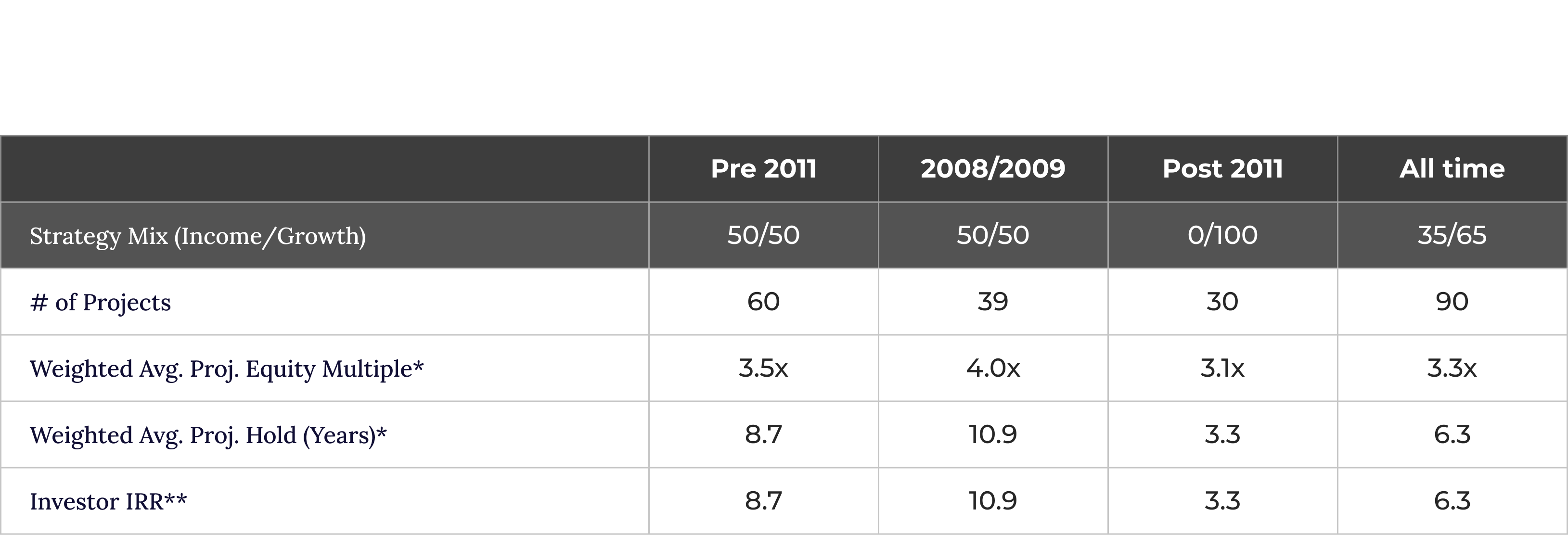 Averages weighted by project equity *Net of fees/promote